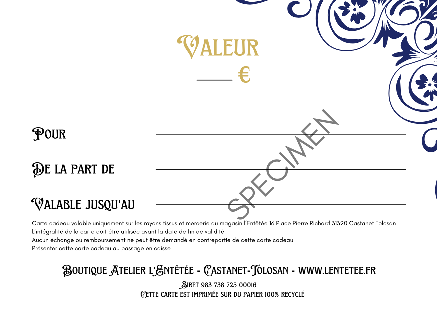 Cette carte cadeau du montant de votre choix (de 10€ à 100€) est à utiliser au magasin de l'Entêtée à Castanet Tolosan.
